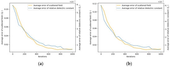 The initial 800 iterations focus on low-resolution imaging. As shown in Figure 6, following the second iteration, there is a noticeable reduction in relative permittivity error, highlighting the effectiveness of the two-step iteration algorithm in significantly minimizing imaging errors, enhancing image resolution, and capturing additional details. In terms of time efficiency, this approach saves more than half the time compared to directly employing high-resolution imaging.