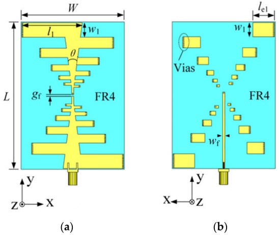 The proposed low-profile ultrawideband antenna with unidirectional pattern. (a) Front side of the antenna; (b) Back side of the antenna. ( = 91 mm, = 64 mm, = 1 mm, = 3 mm, = 37.4, = 8.7 mm, = 13.5 mm, = 1.25 mm, = 1 mm, = 15°).