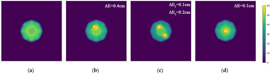 Figure 9 shows the created brain models A–D. The model tested in the experiment consists of two parts: yellow represents the normal area of cerebral white matter, and red represents the abnormal bleeding tissue. Model A represents a normal brain, and B, C, and D are hemorrhage models. In model B, a 2 cm diameter cylindrical simulated hemorrhage area is placed in the upper left corner. In model C, an additional similar simulated hemorrhage lesion is placed in the lower right corner, resulting in two bleeding areas to be detected. Model D places a hemorrhage area at the center.