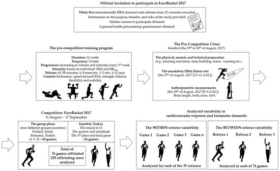 This investigation was an observational cross-sectional study of referees’ cardiovascular and locomotor responses during the FIBA Men’s EuroBasket, which took place from 31 August to 17 September 2017. In total, 76 games (228 officiating cases) were analyzed. Each referee officiated at least three games (range: 3–9 games). See Figure 1 (the studies’ phases).