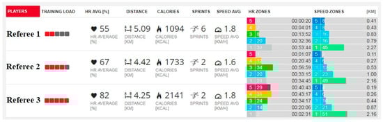 In addition, referees covered most distances (approximately 2.5 km) in lower speed zones (Z1-Z3), which was lower than previously published values. However, it is important to note that referees covered more than 350 m on average in the two highest speed zones, Z4 and Z5 (15.00–18.99 km·h−1 and ≥19.00 km·h−1), which aligns with previously published data [4,25]. This high-speed coverage, together with the total average accelerations and decelerations per game (1105.3 ± 147.6), might impose significant muscular load accompanied by moderate-to-high cardiovascular response.