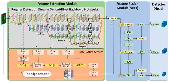 To reduce the impact of interfering information, this paper proposes a two-stream structure in feature extraction, illustrated in Figure 1. The regular detection stream uses DenseHRNet as its backbone, which employs a dense connection mechanism to enhance feature reuse and transfer in the high-resolution HRNet, capturing multi-scale contextual information with different receptive fields. The edge-gated stream filters out irrelevant information through gated convolutional layers, focusing on processing shape boundary information, and incorporates edge detection to enhance edge information learning. Finally, the outputs of the two streams are combined in the feature fusion structure to improve the detection accuracy of small objects.