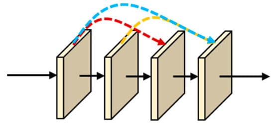 The connection method of the single-resolution branch DenseHRNet, which incorporates dense connections, is shown in Figure 2. If the depth of a resolution branch is layers, then the dense connection establishes connections. The output of the th layer can be expressed as follows: