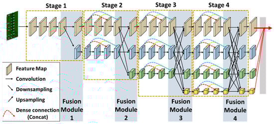 In accordance with the DenseHRNet single-resolution branching implementation method, this paper constructs four branches with different resolutions by downsampling the high-resolution branch three times. This approach extracts four small object features with varying resolutions. A dense connection mechanism is added to each parallel branch from the second to the fourth stage in the original HRNet, creating the DenseHRNet backbone network structure, illustrated in Figure 3. In the fusion modules 2, 3, and 4, each parallel branch first performs batch normalization, followed by ReLU activation. It then reduces the output feature map channels by half using 1 × 1 convolution. Finally, it completes the feature fusion operations, including upsampling and downsampling.