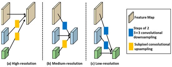In DenseHRNet, the fusion process of different resolution feature maps is illustrated in Figure 4. Within the fusion module, feature maps of the same resolution are directly copied to the next layer. Low-resolution feature maps are upsampled to obtain high-resolution feature maps, and then their channels are matched using a 1 × 1 convolutional layer. High-resolution feature maps are downsampled to obtain low-resolution feature maps, and a 3 × 3 convolutional kernel with a step size of 2 is used for this downsampling in the fusion module. Since feature maps suffer from information loss during downsampling, the fusion module does not use maximum pooling or combined pooling operations to reduce the information loss during downsampling. After completing the upsampling and downsampling processes, the feature maps with different resolutions are fused through corresponding element-wise addition.