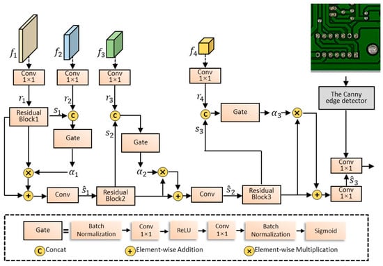 The overall structure of the edge-gated stream is shown in Figure 5, where three gated convolutional layers are used. These layers are crucial in the edge-gated stream because they effectively filter out irrelevant information. This capability allows the stream to suppress non-edge-related information, ensuring that only edge-related feature information is processed. The input of the gated convolutional layer comes from two parts: one is the feature map from this level, which belongs to the low-level features, and the purpose is to filter the irrelevant feature information to obtain the edge feature information. The other is the feature map from the higher level, which is a higher-level semantic understanding of the image and guides the network to extract more complete edge-related features. For each feature map from the shallow layer, a 1 × 1 convolution is performed to generate a regular detection stream feature map . with high-level semantic information are aggregated with the boundary feature map , which passes through the gating unit to generate the attention feature map . In particular, passes through the residual structure to obtain the boundary feature map for the channel, as shown in Equation (2).