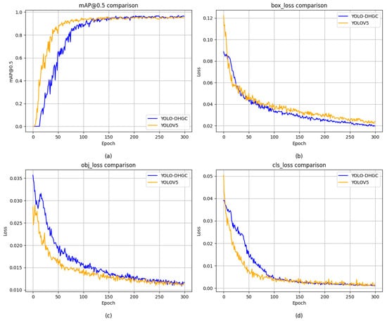 The YOLO-DHGC algorithm proposed in this paper achieved the best results in all accuracy indicators except APL, verifying its effectiveness in detecting small defects on hot-rolled steel surfaces. YOLO-DHGC’s mAP@0.5, mAP@0.75, and mAP@0.5:0.95 were 81.6%, 47.8%, and 50.2%, respectively. These were 4.7%, 1.6%, and 3.0% higher than the baseline method YOLOv5s. The APS for small object detection reached 44.3%, which is 2.8% higher than YOLOv5s, showing a significant improvement in small object detection accuracy. The APL for large object detection was 51.2%, on par with YOLOv5. Overall, YOLO-DHGC outperforms YOLOv5s in all accuracy metrics except APL. Compared to YOLOv7s, the mAP@0.5, mAP@0.75, and small object detection accuracy of APS improved by 1.4%, 0.7%, and 1.2%, respectively. However, the APL for large object detection was 0.6% lower than YOLOv7s.