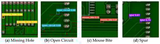 In this paper, the effectiveness of the proposed algorithm is verified using the PKU-Market-PCB small object defect public dataset. The dataset is provided by the Intelligent Robotics Open Laboratory at Peking University. The original dataset contains a total of 693 images with six types of defects. Each image has at least three defects, the smallest being about 10 × 15 pixels, accounting for approximately 0.0031% of the image area. This makes it suitable for examining the performance of small object detection algorithms.