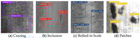 Figure 9 shows the visualization results of the actual detection by YOLO-DHGC. The detected defects included Cracking, Inclusion, Rolled-in Scale, and Scratches. YOLO-DHGC successfully detected all defects with high confidence, achieving the highest confidence of 0.87 when detecting plaque defects. This demonstrates that the YOLO-DHGC algorithm has superior performance in locating and classifying small object defects. In summary, YOLO-DHGC has a comprehensive ability to detect small defects on the surface of hot-rolled steel.