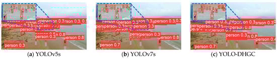 Figure 10 shows the actual detection results of the YOLO-DHGC, YOLOv5s, and YOLOv7s algorithms on the TinyPerson dataset. The results indicate that YOLOv5s missed a large number of small objects, with low detection confidence. YOLOv7s also missed some very small objects. Compared to YOLOv5s and YOLOv7s, YOLO-DHGC detected more small-scale people, classified and located dense crowds better, and had a high confidence level. This indicates that the improvement strategy designed in this paper effectively enhances the algorithm’s detection performance on small objects, not only in industrial settings but also for various small objects in everyday life.