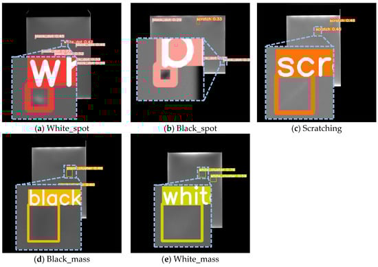 Figure 11 shows a partial enlargement of the detection results for various defects in the backlight panel, including White_spot, Black_spot, Scratching, Black_mass, and White_mass. The proposed algorithm effectively detects these defects with minimal misdetections and omissions.