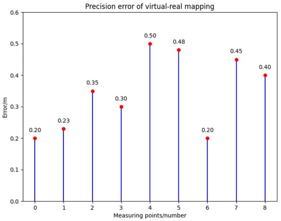 The error distribution of the nine selected reference points is shown in Figure 4. The maximum error was 0.51 m, the minimum error was 0.19 m, and the average mapping error across the test samples was 0.38 m. This error could affect the creation of the drone dataset in the virtual environment. Therefore, a self-checking mechanism was added to the digital twin platform, excluding areas with errors greater than 0.2 m from the drone dataset collection scenes. By implementing this self-checking mechanism, the reliability and accuracy of the virtual dataset creation were improved, reducing the deviations between the virtual and real environments.
