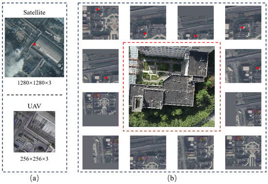 (a) The training set, where the ratio of drone images to satellite images is 1:1. (b) The test set, where drone images are enclosed in red dashed boxes, and satellite images are enclosed in black dashed boxes, with a ratio of 1:12. The solid red dots in the images indicate the actual positions of the drones in the satellite images.