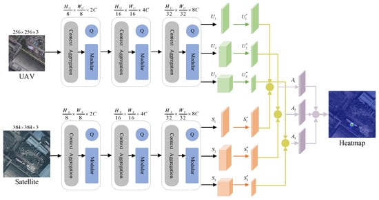 Among the methods that use cross-view image matching to address UAV navigation in GNSS-denied environments, there are two primary approaches: retrieval-based methods [16] and direct image point-matching methods [17]. Retrieval-based approaches rely on building a massive image database, where UAV images are matched against satellite images in the database to estimate location. During training, metric learning is used to reduce the distance between UAV images and similar satellite images to improve location estimation. However, these methods require pre-collecting and constructing extensive image datasets, and mismatches can degrade localization accuracy, posing challenges for computational storage and processing. In contrast, Feature Point-based Inference (FPI) adapts concepts from object tracking, directly identifying corresponding locations on satellite images using UAV images, thereby reducing dependency on a satellite image database for cross-view matching. FPI employs a Siamese network with separate branches that extract features from UAV and satellite images without shared weights. By calculating the similarity between UAV and satellite feature maps, a heatmap is generated to map the UAV’s position onto the satellite image. However, this approach compresses feature information through multiple layers, leading to a significant loss of spatial details. Moreover, using only the final feature layer for similarity calculations can hinder localization accuracy. The datasets used in FPI are also limited, containing images from just 14 universities, which may limit the model’s generalization across diverse real-world scenarios, thus affecting practical localization accuracy.