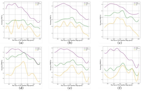We further evaluated the model’s performance on satellite maps of varying scales (ranging from 700 pixels to 1800 pixels). As illustrated in Figure 10, the performance of FPI, WAMF-FPI, and VRLM was analyzed across six images, each representing the model’s localization accuracy at different satellite image scales for 5 m, 10 m, 20 m, 30 m, 40 m, and 50 m accuracy levels. The x-axis indicates the scale of the satellite images, while the y-axis shows the corresponding localization accuracy at each level. The results demonstrate that the VRLM model consistently outperformed both FPI and WAMF-FPI across all scales of satellite maps, highlighting its robustness and generalization capability when dealing with data at different resolutions.