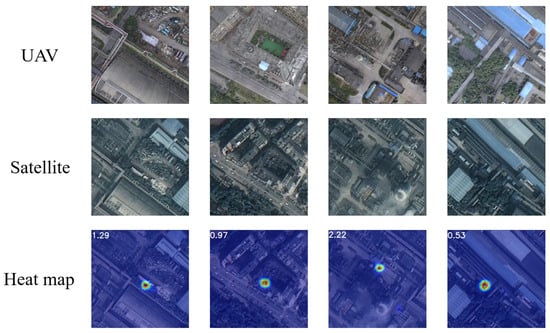 The visualization of the geographic localization results using the VRLM network model is presented in Figure 11. The first row shows the UAV aerial images that require location queries as input to the network, while the second row represents the corresponding satellite images of the query regions. The third row displays the geographic localization results predicted using a heatmap, where the green circles indicate the actual geographic locations, and the blue circles represent the predicted geographic locations based on the output of the localization model. The numerical values in the upper left corner provide a direct measure of the meter-level displacement between the predicted results and the actual labels, vividly illustrating the model’s spatial localization capability.