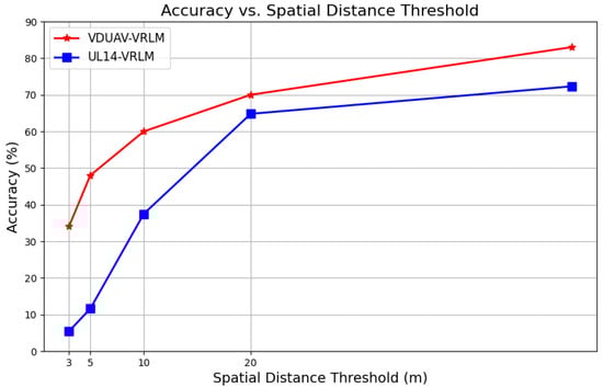 The higher accuracy of the VDUAV dataset at smaller distance thresholds demonstrates its potential for precise localization in scenarios requiring detailed spatial information. These findings highlight the importance of both dataset quality and partitioning strategies in model performance evaluation.