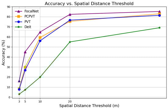 We conducted experiments using the same baseline model and hyperparameter settings on both the UL14 and VDUAV datasets. As shown in Figure 12, the VDUAV dataset significantly outperforms the UL14 dataset at smaller spatial distance thresholds (5 m and 10 m). This discrepancy in accuracy can be attributed to the sampling heights used during data collection. The VDUAV dataset, collected at higher altitudes, captures more spatial features, resulting in richer images and improved localization accuracy. Another potential reason for the performance difference is the method of dataset partitioning. The VDUAV dataset was uniformly sampled across multiple regions and scenarios and then divided into training and test sets at a 3:1 ratio. Due to the dense sampling, some test images might overlap with the training set, enhancing model accuracy. In contrast, the UL14 dataset used 10 universities for the training set and a completely separate set of 4 universities for the test set, ensuring no overlap between the training and test data.