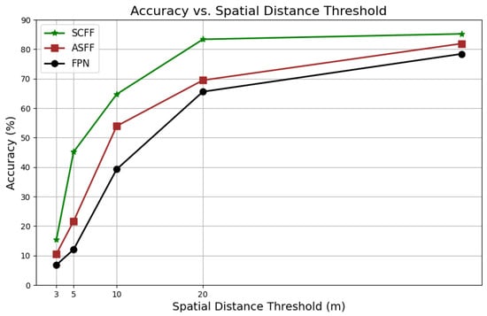 As depicted in Figure 14 and Table 6, the experimental results indicate that the model’s localization performance significantly improved after feature fusion with SCFF, achieving an RDS evaluation metric of 74.13%. In comparison, FPN and ASFF achieved 62.94% and 66.29%, respectively. Specifically, FPN integrates features from different levels through top-down sampling and lateral connections, but its fixed feature fusion approach limits flexibility in handling multi-scale features. Although ASFF enhances flexibility by adaptively selecting and fusing features of different scales through learning weights, it incurs higher computational complexity.