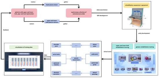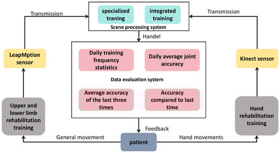 The system is rehabilitated for patients with dysfunction of upper and lower limbs. Patients make corresponding actions on the upper and lower limbs rehabilitation assessment and training equipment (hereinafter referred to as the rehabilitation evaluation equipment). For example, when the patient conducts rehabilitation training for the entire body’s large joints, the patient needs to face the equipment between 1 m and 3 m and perform rehabilitation training campaigns on the upper and lower limbs. The Kinect sensor device collects the patient’s movement trajectory and transmits it to Unity3D 2022.1 and 3DMAX 2021. In the scene processing system constructed by other simulated software, the scene processing system is mainly composed of two modules: special training and comprehensive training. Then, the scene processing system processes the rehabilitation training tasks and rehabilitation training requirements in the virtual scenario and transmits the processing results to the data evaluation system module. The data assessment system module can record the following according to the accuracy of the patient’s posture: the daily training number statistics, the daily average joint accuracy, the average accuracy of the past three times, and the accuracy compared with the last time. Finally, feedback on the processing results is provided to the patients. Similarly, when the patient conducts hand rehabilitation training, they only need to hang up at the front of the rehabilitation assessment equipment and perform the corresponding training exercise. The system frame structure is shown in Figure 1.