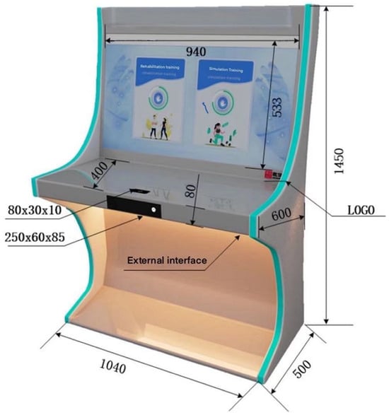 The equipment used in this study was completely jointly developed by laboratory members. This product provides a highly comprehensive integrated treatment, training, and rehabilitation solution for patients with upper and lower limb movement disorders and hand dysfunction. The external structure of this product is made of metal to ensure product quality is strong, durable, stable, and safe. This product consists of a vertical all-in-one machine, a 43-inch large touch screen, and a touch monitor. It contains a Kinect2.0 somatosensory depth camera to detect and record patients doing motor dysfunction rehabilitation training and a Leap Motion gesture tracker to detect and record the medical treatment and rehabilitation status of patients with hand dysfunction. This product is independently developed throughout the entire process and is combined with software and hardware servers. Patient data can be transferred to the cloud and saved in real-time for subsequent doctor treatment needs. The full name of this equipment is the upper, lower limb, and hand Rehabilitation training assessment instrument, as shown in Figure 2. This product provides entertaining interactive training courses for patients with motor dysfunction. It uses a somatosensory camera to capture human movements. By comparing the accuracy of actual movements with standard movements, interaction with objects in the game training scene can be achieved, thereby improving the patient’s subjective initiative in rehabilitation training.