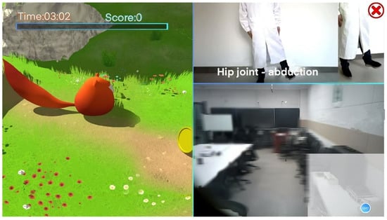 For example, in the trunk-flexion movement in special training, the patient stands in front of the device and makes the corresponding training posture according to the teaching video content prompted in the upper-right corner of the screen; in the lower-right corner, the patient can see his own movement trajectory information; on the left side of the screen is a virtual scene designed by this system. The small animals in the scene will give corresponding feedback according to the standard degree of the patient’s actions, such as jumping forward and picking up the gold coins in front. Prompts such as scores, time, and progress bars make the rehabilitation training more interesting for patients, as shown in Figure 6.