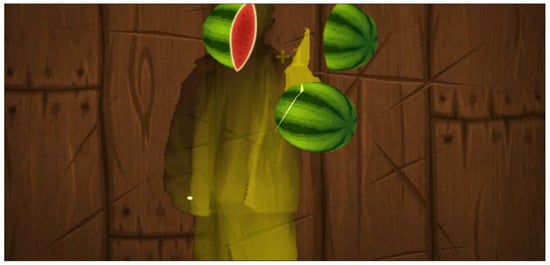 Of course, in addition to nine different special trainings, this system also has some interesting random action exercises. Patients need to make corresponding actions according to the screen prompts. The distant screen will move from far to near as time goes by. If the patient’s actions are standard, there will be score feedback. If the patient’s actions are not standard, there will be a corresponding punishment mechanism, as shown in Figure 7. Similarly, the system has built-in a set of interesting training for cutting fruits based on the patient’s movements, as shown in Figure 8.