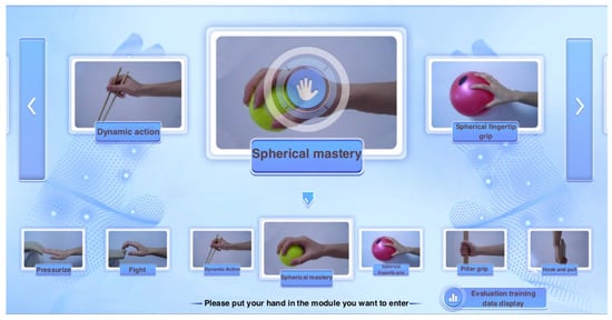Patients with upper and lower limb and hand dysfunction stand in front of the device and make corresponding movements. The patient’s motion data can be collected by the corresponding sensor and transmitted to the virtual program scene developed by Unity. The upper and lower limbs in this system provide are nine virtual scenes in the rehabilitation training, which are dedicated to training the following posture movements: neck, shoulder joint, shoulder joint 2, elbow joint, wrist joint, trunk, hip joint, hip–knee joint, and ankle joint. For the corresponding hand, there are 13 virtual scenes in the Ministry of Sports Rehabilitation training, which are dedicated to training the following posture movements: hanging, lifting, touching, pushing, hitting, dynamic operation, spherical grasp, spherical finger grip, columnar grasp, hook and pull, two-fingertip pinch, multiple-fingertip pinch, and side pinch. Patients undergo the above special training, and through system evaluation, visualized evaluation data are output and finally fed back to the patient so that the patient can adjust in real-time based on the training data to improve the accuracy of his rehabilitation training. Figure 4 shows the interaction between collected data and virtual scenes.
