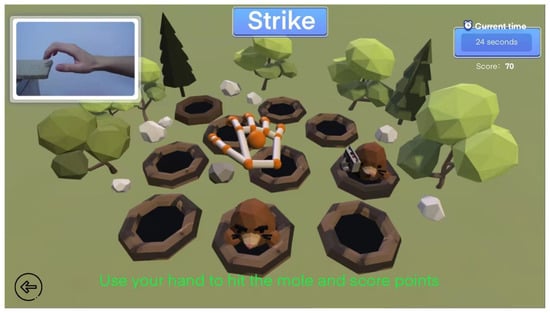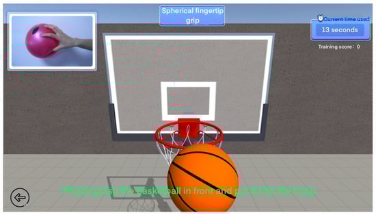Here, we take the ball-shaped fingertip grip and hitting in the 13 special gesture training as examples. In the ball-shaped fingertip grip virtual scene, the patient will make grabbing movements according to the prompts in the scene and put the basketball into the ball. The more you put into the backboard within the specified time, the higher your score will be, as shown in Figure 10. In the virtual scene of special hitting training, patients need to perform standard hitting movements and hit the hamsters in the virtual scene with their hands. Within the specified time, the more hamsters hit, the higher the score, as shown in Figure 11. In this type of fun training, patients will not feel bored and will also record the training data in the game.