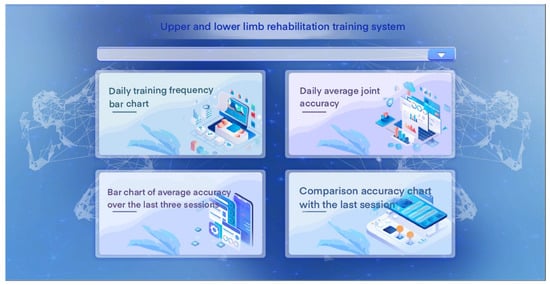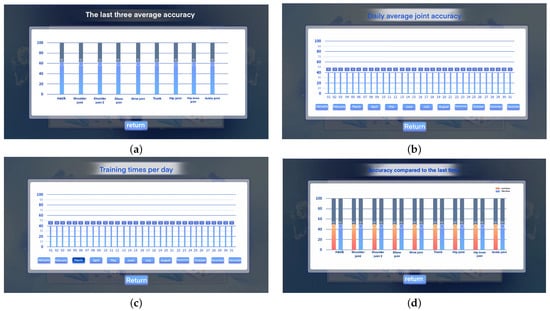 As shown in Figure 13, the system can record the patient’s rehabilitation training data, including a bar graph of the number of daily training sessions, a bar graph of the average joint accuracy of the past three sessions, and a chart comparing the accuracy with the last session. The detailed data display interface is shown in Figure 14. Among them, Figure 14a is an interface for recording the average accuracy of the last three rehabilitation training sessions. Figure 14b is an interface for recording the average joint accuracy of daily rehabilitation training. Figure 14c is an interface for recording the number of daily rehabilitation training sessions. Figure 14d is an interface for comparing the accuracy with the last rehabilitation training session.