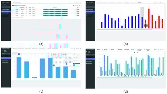 Patient rehabilitation training data record. Among them, Figure (a) is the interface for recording the average accuracy of the last three rehabilitation training sessions. Figure (b) is the interface for recording the average accuracy of joints in daily rehabilitation training. Figure (c) is the interface for recording the statistics of the number of daily rehabilitation training sessions. Figure (d) is the interface for comparing the accuracy with the last rehabilitation training session.