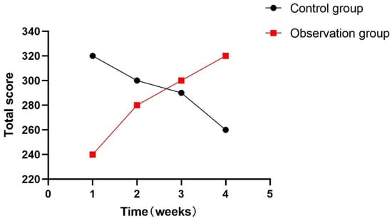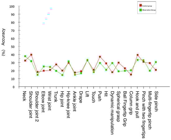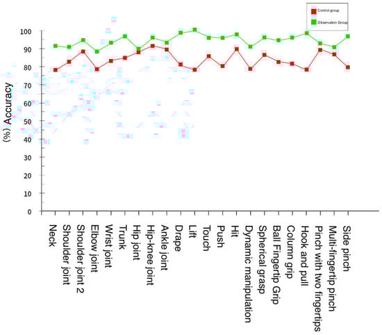 During this rehabilitation training, the system recorded the changes in rehabilitation data parameters of each participant before and after training to measure the effectiveness of the training system. The experiment found that each participant’s rehabilitation training effect improved. Taking the data in Table 3 and Table 4 as an example, it can be seen that before traditional rehabilitation training or virtual reality rehabilitation training, the standard rates of rehabilitation training for members of the control group and observation group are similar, as shown in Figure 16.
