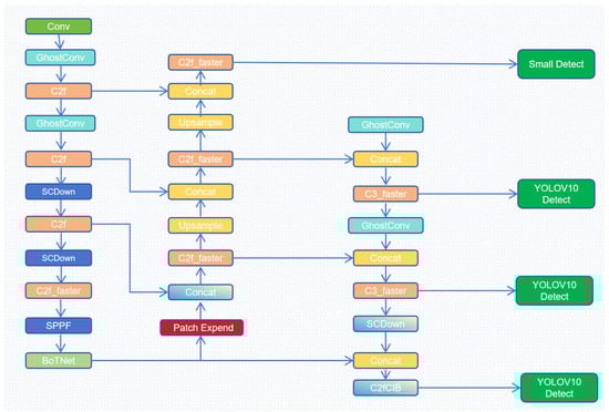 - We propose a novel network architecture for small object detection and validate its effectiveness through experiments based on BGF-YOLOv10. By incorporating the multi-head attention module from BoTNet [] into the backbone to enhance the model’s capability to capture information, and by introducing the improved C2f and C3 modules into the neck, we further improve detection speed.