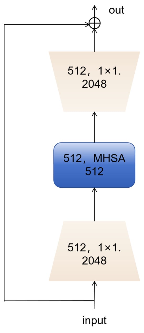 To enhance baseline detection performance while reducing the number of parameters and introducing minimal additional latency, we replaced the original PSA module in the YOLOv10 backbone with the BoTNet [] layer. The core idea of the multi-head self-attention (MHSA) mechanism is to compute the relationships between each position in the input sequence and all other positions simultaneously using multiple attention heads, thereby capturing different feature subspaces. Convolutional models excel in parameter sharing and efficient local information aggregation, but acquiring global information requires stacking numerous convolutional layers. In contrast, the self-attention mechanism inherently captures global information, reducing the model’s depth. BoTNet [] replaces the last three spatial (3 × 3) convolutions in ResNet with multi-head self-attention (MHSA). The memory requirement of the self-attention mechanism scales quadratically in the spatial dimension, leading to high memory and computational demands when processing large input images. By first using convolutional layers to extract low-resolution features, ResNet reduces the memory footprint before feeding them into the self-attention mechanism, as shown in Figure 2.