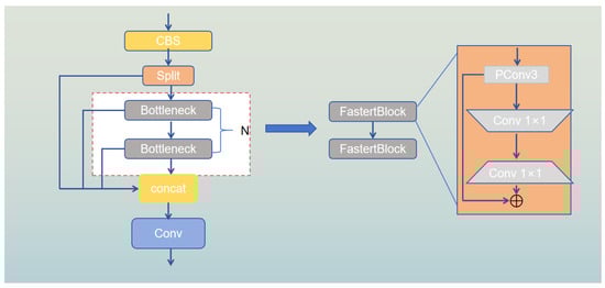 To maintain inference speed, we drew inspiration from FasterNet and replaced the Bottleneck in C2F with FasterBlock, achieving higher floating-point operations (FLOPs). FasterNet’s PConv (Partial Convolution) plays a crucial role in reducing computational redundancy and memory usage. In facilitating continuous memory access, PConv uses the number of channels as a representative of the entire feature map for computation. The FLOPs of the convolutional layer are expressed as shown in Equation (1):