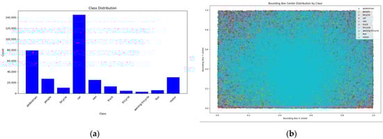 The VisDrone2019-DET dataset was collected by the AISKYEYE team from the Machine Learning and Data Mining Laboratory of Tianjin University, China. This benchmark dataset consists of 10,209 static images. Figure 5a visualizes the class distribution in VisDrone2019, which includes 10 categories (pedestrian, people, bicycle, car, van, truck, tricycle, awning-tricycle, bus, and motor). There is a significant imbalance in the number of labels for different object classes, leading to uneven label distribution across the dataset. The label positions in Figure 5b show that the dataset contains a large number of small and tiny objects. The UAVDT dataset consists of 23,258 training images and 15,069 test images with a resolution of 1024 × 540. For our experiments, we only used images containing the “car” class.