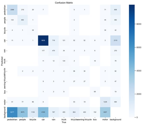 As shown in Figure 7, the confusion matrix illustrates the model’s classification performance across different categories. The main diagonal shows the number of correctly classified instances, with the “car” category achieving 9656 correct classifications and the “pedestrian” category achieving 2368, indicating strong performance. Notable misclassifications include “car” being incorrectly classified as “van” 716 times and “pedestrian” being misclassified as “people” 219 times, indicating confusion between these categories. Background classes also exhibit some misclassifications, such as “pedestrian”, “bicycle”, and “people”, highlighting challenges in distinguishing between objects and backgrounds. Rare categories like “awning-tricycle” and “bus” show more significant misclassifications, reflecting issues with long-tail data imbalance.