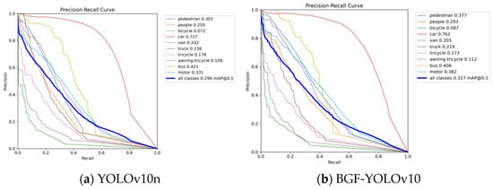 As shown in Figure 8, the overall average precision (mAP) at an IoU threshold of 0.5 for all classes is 0.317, which represents an improvement of 0.021 over the baseline. Although the PR curves for most categories show a decrease from the first to the second plot, particularly for categories like “pedestrian” and “motor”, where both precision and recall have improved, the overall curves for each category are closer to the lower left corner, indicating a decrease in precision. The performance of the “bus” category shows a slight reduction, but the curve in plot (b) demonstrates an improvement over plot (a), with a slight increase in mAP.