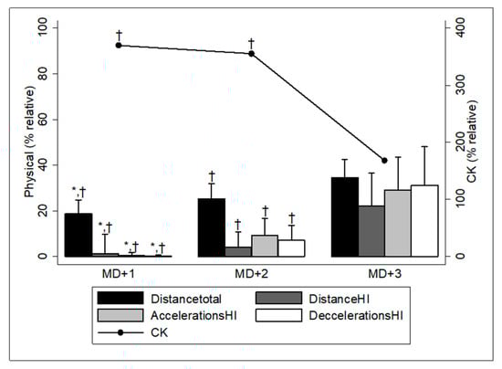 Physical demands and CK blood levels at MD+1 (24 h), MD+2 (48 h), and MD+3 (72 h) according to the MD results. HI: high intensity; CK: creatine kinase. * Significant differences with respect to 48 h; † significant differences with respect to 72 h.