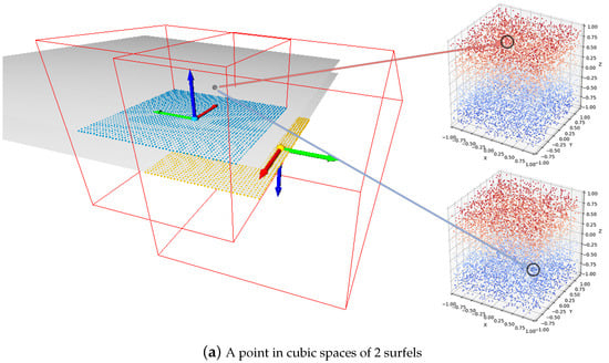 where denotes a set of surfels whose cubic space contains the point , and refers to the size of the bounding box, which is defined in Equation (3).