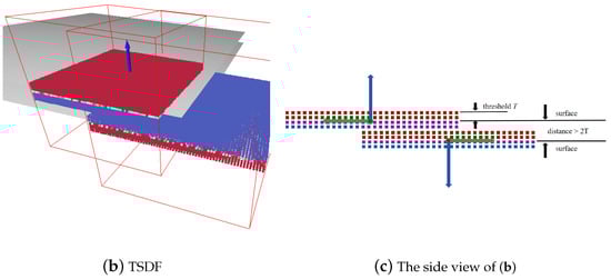 A point can be present in two surfel cubic spaces that are not neighbors, resulting in outliers. There are many such cases in our system, such as corners or on the upper and lower surface of a table. In (a), this point is positive (red) for the upper surface and negative (blue) for the bottom surface. To address this issue, we make use of the truncated signed distance function (TSDF) to truncate points with large signed distance values. Illustrated by (b,c), this approach is based on the assumption that distances on all surfaces are larger than , where T is a specified threshold.