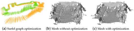 Conversely, surfel-based approaches maintain the global model using a set of surfels [18], which are circular discs characterized by positions and normals that are incrementally updated from new frames. This method circumvents the memory overhead associated with volumetric grids and reduces redundancy found in point cloud representations. Building on [15], ElasticFusion [2] integrates real-time loop closure handling similar to the techniques described in [3]. Furthermore, ref. [19] presents a probabilistic surfel map representation for Simultaneous Localization and Mapping (SLAM), utilizing a post-processing step to reconstruct a mesh from deformed keyframe depth maps. However, because each depth map is processed independently, this approach can result in the creation of multiple meshes for the same surface, leading to inconsistencies in the global map.