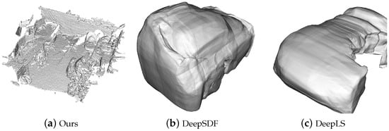 - Park, J.J.; Florence, P.; Straub, J.; Newcombe, R.; Lovegrove, S. Deepsdf: Learning continuous signed distance functions for shape representation. In Proceedings of the IEEE/CVF Conference on Computer Vision and Pattern Recognition, Long Beach, CA, USA, 15–20 June 2019; pp. 165–174. [Google Scholar]