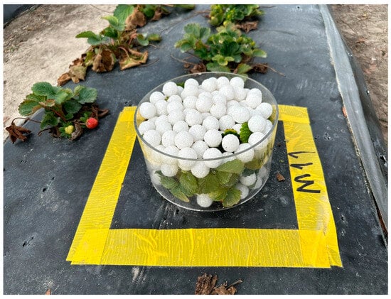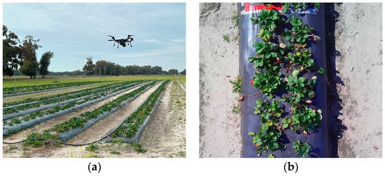A strawberry experimental field was prepared in the Plant Science Research and Education Unit (PSREU) at the University of Florida in Citra, Florida, USA, during the 2023–2024 growing season. The field comprised eight rows of strawberry plants and two rows of sprinklers, with an approximate total size of 61 m long and 20.7 m wide. Four rows of the ‘Brilliance’ cultivar were planted in the northern half of the field, while the other four rows in the southern half consisted of the ‘Medallion’ cultivar. The ‘Brilliance’ cultivar is characterized by its broad-spread leaves [47], in contrast to the more compact and upright structure of the ‘Medallion’ cultivar [48]. Each row contained two alternating lines of strawberry plants. The overripe fruits, runners, dead leaves, and weeds were removed regularly.