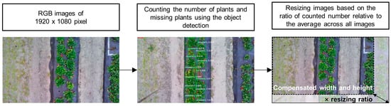 A flowchart of the object detection-based image preprocessing to resize the images using the ratio of the number of counted plants and missing plants to the average number of plants and missing plants across all images (Equations (1)–(3)).