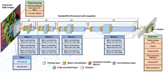 The CNN model was developed to estimate canopy volumes from input RGB images with a resolution of 512 × 512 pixels. As shown in Figure 4, the CNN structure was designed to accept only RGB images as inputs and generate single volume outputs, differing from the two-stage CNN model used for growth index estimation with RGB-D images, as presented by Gang et al. [34]. The model architecture was developed using the TensorFlow 2.5.1 framework and Python 3.8.