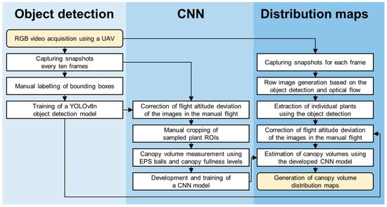 Therefore, this study developed a CNN model based on only RGB images obtained with a UAV operated in manual mode for rapid and accurate prediction of strawberry canopy volumes. The accuracy of the CNN model was compared to a linear regression model based on conventional simple geometry using a paraboloid. Image preprocessing and image synthesis methods based on object detection were designed using the You Only Look Once (YOLO) algorithm to compensate for the changes in altitude during manual flight and to match RGB images without the GNSS information to generate entire row images. Finally, the developed CNN model was applied to the row images to construct a map displaying spatial variability in canopy volumes at varying locations in a field.