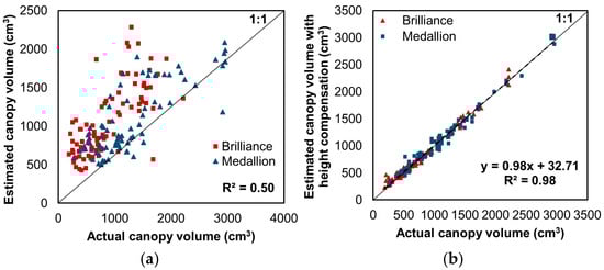(a) Comparison of canopy volumes estimated from the linear regression model using a paraboloid shape and the actual canopy volumes measured using EPS balls. (b) Comparison of canopy volumes estimated from the developed model using RGB test dataset images and measured canopy volumes with height compensation using the object detection model. The color symbols represent the values for each strawberry variety. The dashed line shows the regression line.