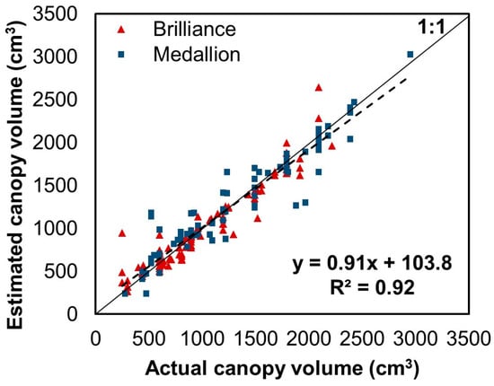 The R2 and RMSE of the Brilliance variety were 0.98 and 68.5 cm3, and those of the Medallion variety were 0.98 and 73.7 cm3, respectively. Because the maximum Brilliance canopy volume for the test dataset was smaller than that of Medallion, the RMSE of Brilliance was slightly lower. Nevertheless, the overall volume prediction performance of the developed model was similar for both varieties and deemed acceptable considering the underlying factors, such as variations in altitude and shooting angles resulting from the manual UAV flight, the presence of weeds in the field, occlusion between plants, and potential errors in counting the EPS balls. In short, the developed model displayed significantly improved performance compared to the volume prediction using the paraboloid. In addition, the prediction speed of the developed CNN model was 0.05 s per image in the environment described in Section 2.3.