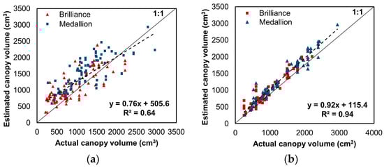 Comparison of canopy volumes estimated from the developed model and the actual canopy volumes measured using EPS balls, (a) when 100% of canopy volume converted from canopy fullness level was used as target value and (b) when a 50/50 mix of converted canopy volume and canopy volume measured using EPS balls was used as target value. The color indices denote the values for each strawberry variety. The dashed lines show the regression lines.